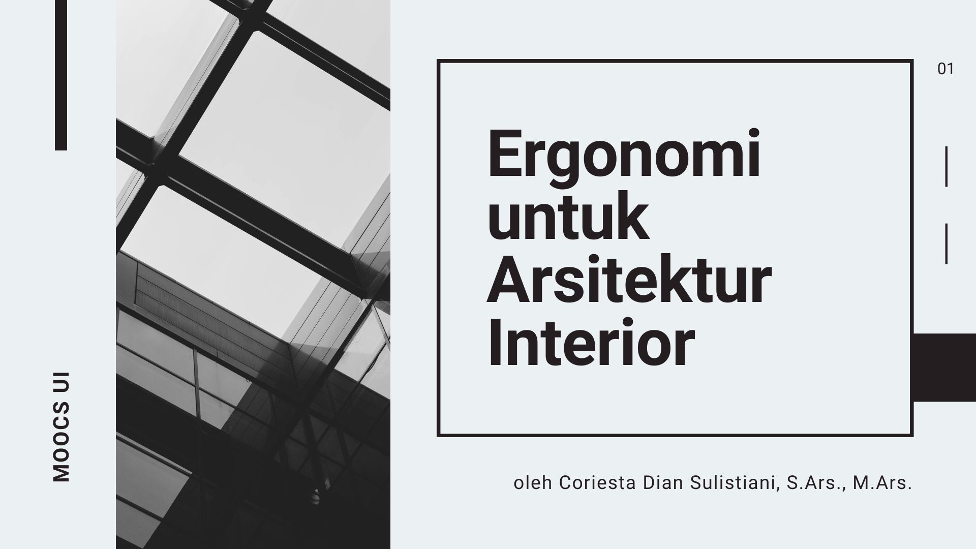 Selamat datang di mata kuliah Ergonomi untuk Arsitektur Interior ENAI600018 dan selamat bergabung dengan pembelajar lainnya. Mata kuliah ini akan mempelajari tentang konsep dasar ergonomi, faktor manusia (Human Factors and Ergonomics /HFE) dan pengetahuan mengenai desain yang universal yang dapat digunakan dalam proses perancangan ruang interior. Setelah mempelajari MK ini, diharapkan Anda mampu untuk menganalisis karakteristik dan kebutuhan pengguna serta pengetahuan tentang ergonomi dan antropometri dan menerapkannya sebagai dasar menetapkan persyaratan kontekstual dan fungsional untuk berbagai jenis ruang interior. Jumlah SKS mata kuliah ini adalah 2 SKS dan diberikan untuk jenjang S1. Estimasi waktu pembelajaran MOOCs ini adalah 30 jam. MOOCs berbahasa Indonesia ini akan dijalankan dengan moda Self-Paced. Metode yang digunakan adalah blended dengan menggunakan MOOCs dan Zoom Meeting. Beberapa aktivitas pembelajaran yang akan dilakukan antara lain konsep dasar ergonomi, faktor manusia (Human Factors and Ergonomics /HFE) dan pengetahuan mengenai desain yang universal. Apabila Anda memiliki kendala teknis terkait Learning Management System (LMS) MOOCs UI, sampaikan pada forum Pusat Bantuan Pembelajar atau menghubungi Helpdesk di live chat idols.ui.ac.id pada jam operasional kerja Senin-Jumat pukul 08.30 - 17.00 WIB.