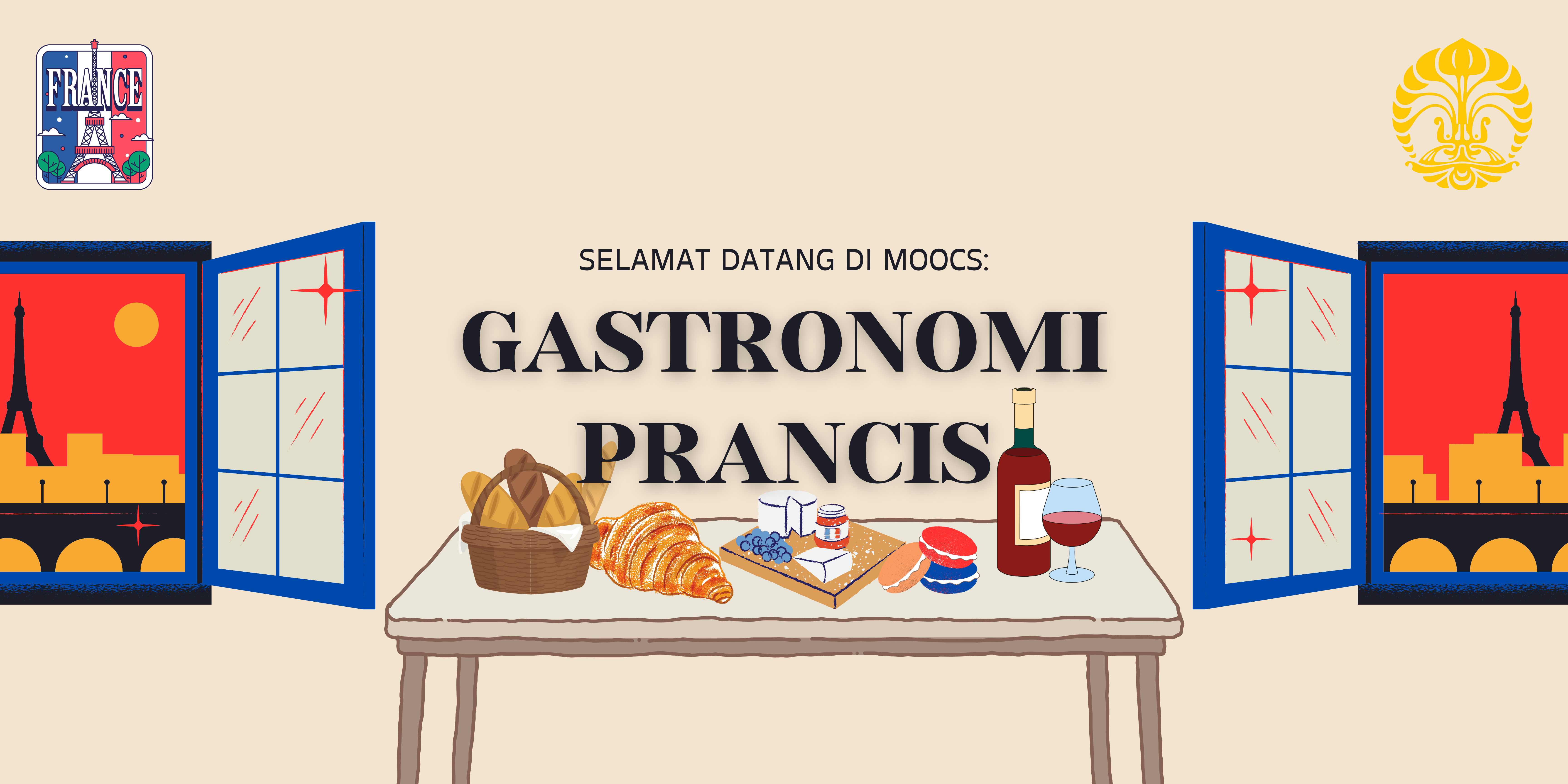 Selamat datang di Mata Kuliah GASTRONOMI PRANCIS dan selamat bergabung dengan pembelajar lainnya. Kami bersemangat dengan kehadiran Anda semua dan berharap partisipasi Anda dalam komunitas pembelajar di kelas ini. Mata Kuliah ini akan mempelajari tentang gastronomi Prancis, sebuah tradisi kuliner yang merepresentasikan Prancis dan diakui sebagai salah satu Warisan Tak Benda Dunia. Setelah mempelajari mata kuliah ini, diharapkan Anda mampu memiliki pengetahuan yang memadai tentang kekayaan kuliner Prancis dan pengaruhnya bagi seni kuliner global, serta memahami filosofi di balik tradisi kuliner Prancis..