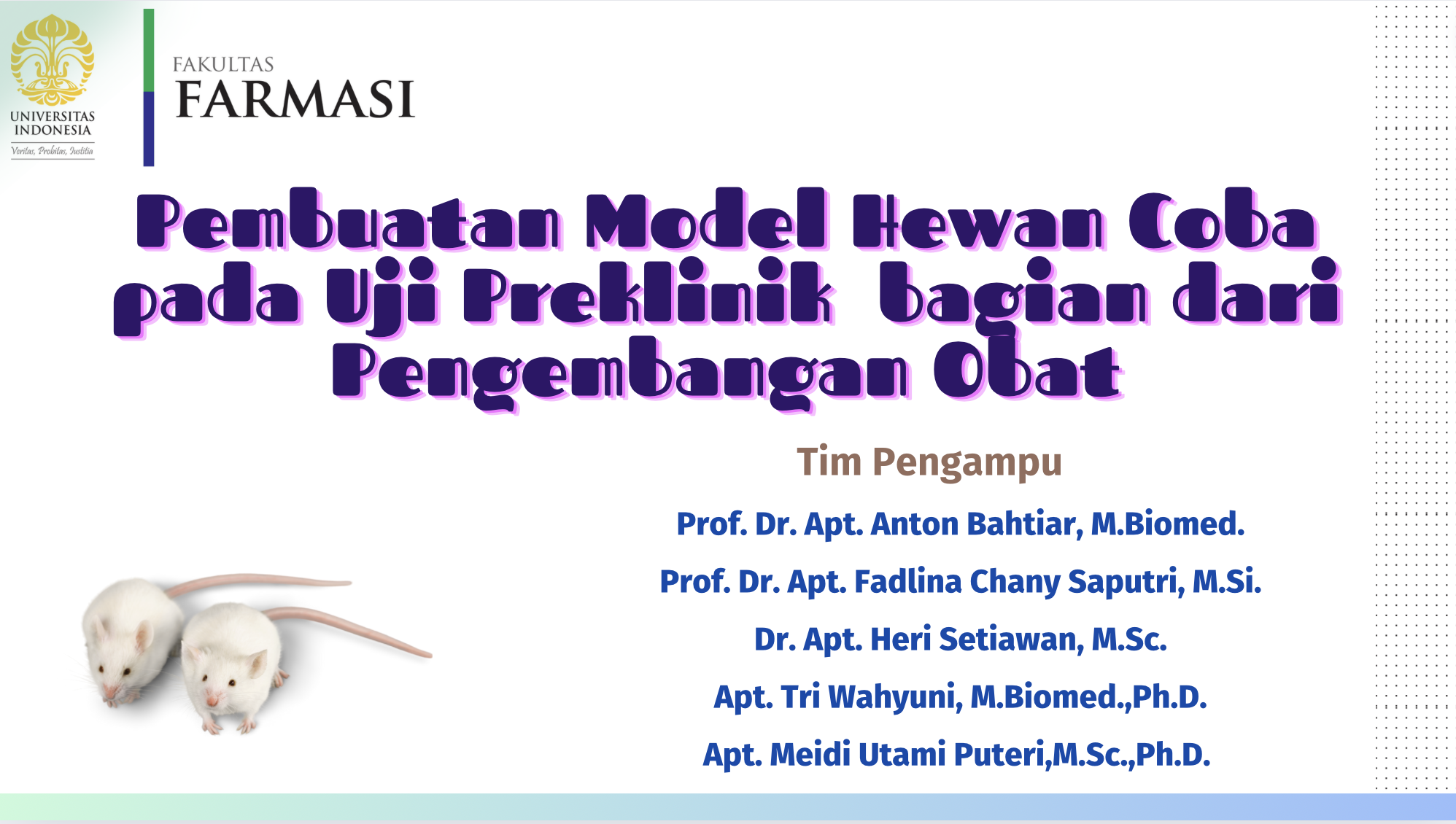 Selamat datang di mata kuliah Pembuatan Model Hewan Coba pada Uji Preklinik bagian dari Pengembangan Obat dan selamat bergabung dengan pembelajar lainnya. Mata kuliah ini akan mempelajari tentang dasar-dasar pembuatan pemodelan hewan coba yang digunakan dalam suatu penelitian pada penemuan dan pengembangan obat. Setelah mempelajari MK ini, diharapkan Anda mampu untuk mampu menjelaskan bagaimana pembuatan beberapa model hewan coba yang digunakan pada uji preklinik yang merupakan bagian dari pengembangan obat.