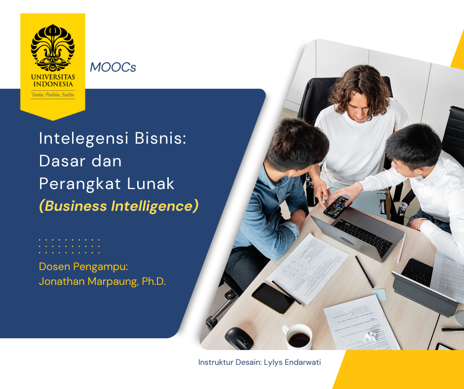 Selamat datang di mata kuliah Intelegensi Bisnis: Dasar dan Perangkat Lunak dan selamat bergabung dengan pembelajar lainnya. Mata kuliah ini akan mempelajari tentang bidang yang berfokus pada penggunaan data dan teknologi untuk membantu organisasi dalam mengambil keputusan yang lebih baik. Setelah mempelajari MK ini, diharapkan Anda mampu untuk meningkatkan kemampuan analisis data atau bagi yang tertarik mengembangkan karier di bidang analisis bisnis dan teknologi informasi.