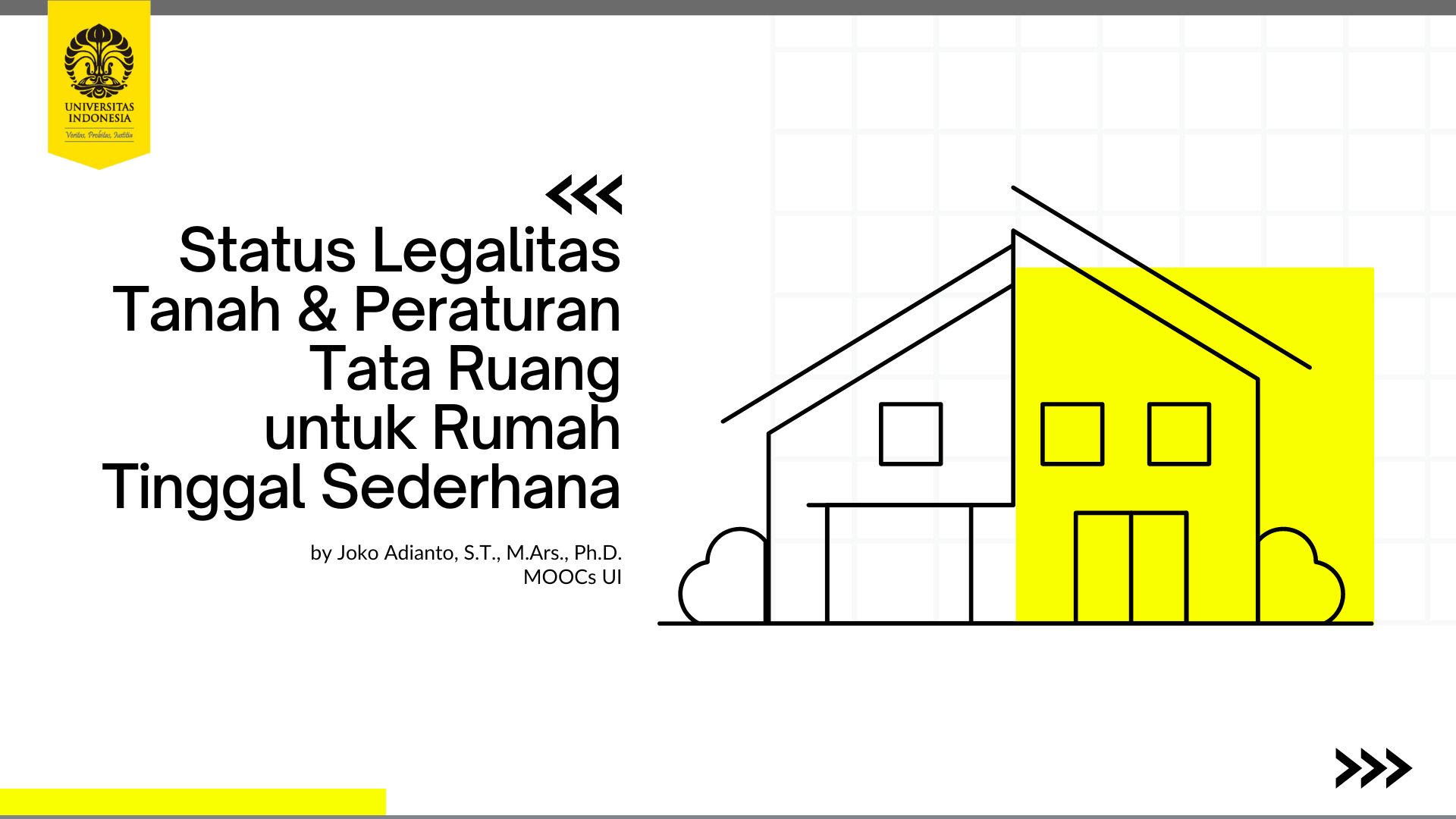 Setelah mengikuti kelas ini, Anda diharapkan bisa memahami perancangan rumah tinggal sederhana yang sesuai dengan peraturan bangunan gedung. Pengetahuan perancangan rumah tinggal sederhana di kelas ini melingkupi: aspek-aspek penting dalam merancang rumah tinggal, pemahaman tentang dokumen rancangan arsitektur, dan pembuatan dokumen rancangan arsitektur rumah tinggal. Referensi yang menjadi acuan kajian di kelas ini utamanya bersumber dari dokumen pemerintah (dalam bentuk peraturan, ketentuan, panduan, dan sumber-sumber lain) baik di tingkat nasional maupun propinsi/daerah, yang berhubungan dengan perencanaan dan perancangan bangunan gedung rumah tinggal. Selain dari dokumen pemerintah, beberapa definisi yang bersifat umum juga mengacu ke laman Kamus Besar Bahasa Indonesia (kbbi.kemdikbud.go.id)