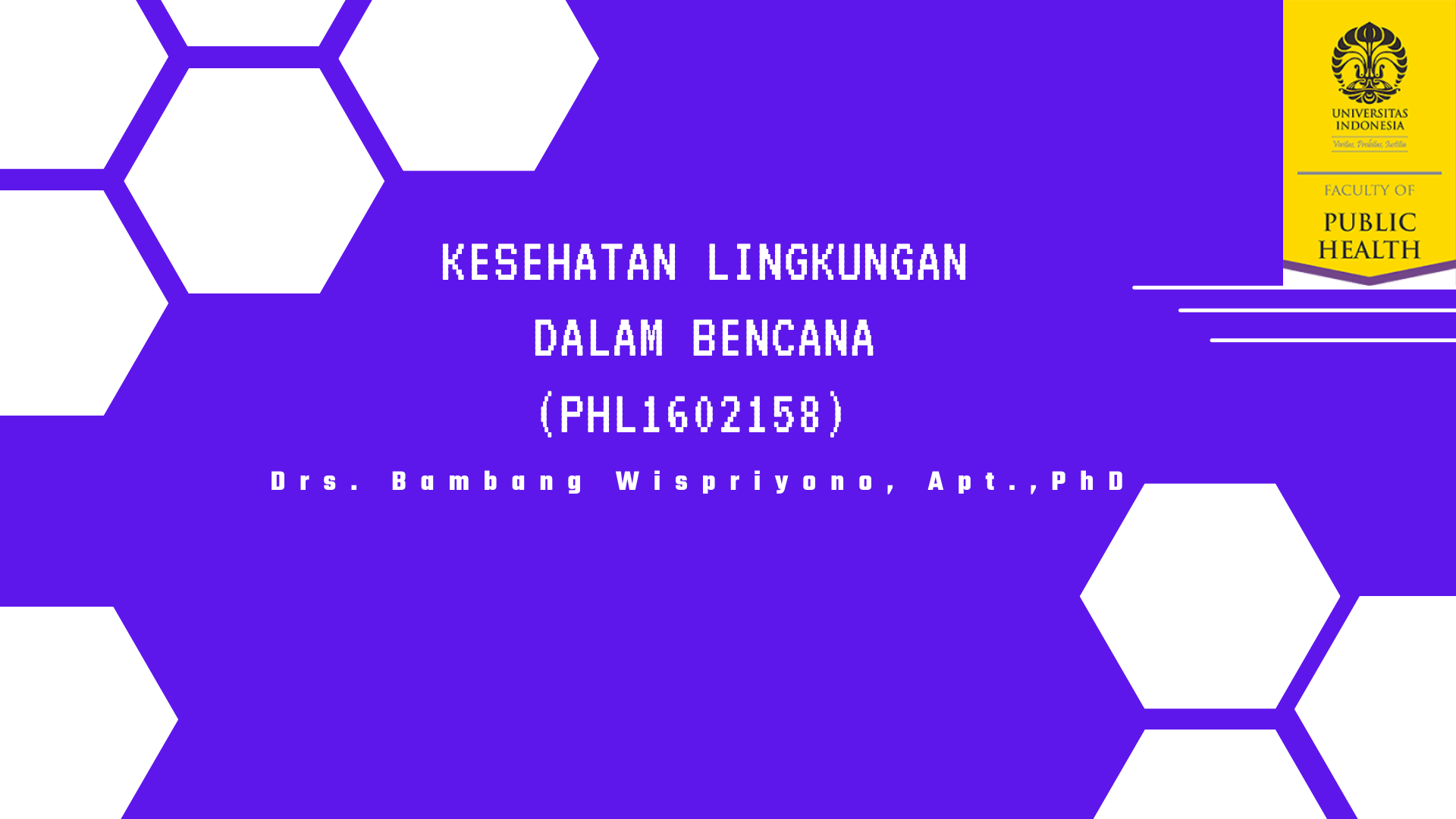 Selamat datang di mata kuliah Kesehatan Lingkungan Dalam Bencana dan selamat bergabung dengan pembelajar lainnya. Kesehatan Lingkungan Dalam Bencana (PHL1602158) merupakan mata kuliah yang mempelajari aspek-aspek kesehatan dan lingkungan pada siklus kejadian bencana pre, saat, dan pasca bencana, serta peran tenaga kesehatan lingkungan pada saat kejadian bencana dan tanggap darurat melalui pendekatan metode pemelajaran aktif di kelas, diskusi kepustakaan, dan penugasan kasus. Setelah mempelajari MK ini, diharapkan Anda mampu untuk menerapkan prinsip-prinsip penanggulangan bencana dan tanggap darurat dalam aspek kesehatan lingkungan dari mulai perencanaan, pelaksanaan, dan evaluasi.  Jumlah SKS mata kulaih ini adalah 2 SKS dan diberikan untuk jenjang S1. Estimasi waktu pembelajaran MOOCs ini adalah 16 minggu. Bahasa pengantar yang digunakan dalam MOOCs ini adalah Bahasa Indonesia. MOOCs dijalankan dengan moda Instructor-Led. Metode yang digunakan adalah Blended, yaotu Asinkronus menggunakan Idols UI (belajar mandiri dan forum diskusi) dan Sinkronus menggunakan Zoom Meeting. MOOCs ini tidak dipungut biaya. drs. Bambang Wispriyono, Apt, PhD email: bwispri@ui.ac.id