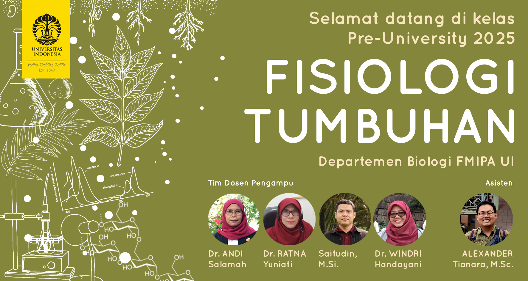 Melalui mata kuliah ini, Saudara akan memiliki kesempatan untuk berinteraksi dengan para penyelenggara mata kuliah ini, yaitu Tim Dosen Fisiologi Tumbuhan Departemen Biologi, Fakultas Matematika dan Ilmu Pengetahuan Alam, Universitas Indonesia. Setiap dosen memiliki kepakaran di bidang fisiologi tumbuhan dengan fokus peminatan yang beraneka ragam.