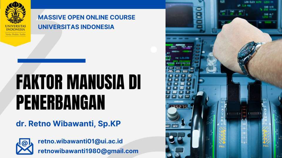 Mata kuliah ini akan mempelajari tentang Faktor Manusia dalam Penerbangan, dan dirancang untuk dapat diikuti oleh  dokter, pilot, dan komunitas penerbangan yang  tertarik dengan kesehatan dan keselamatan penerbangan. Program ini bertujuan untuk memberikan pemahaman tentang aspek-aspek faktor manusia yang mempengaruhi human performance dan keselamatan penerbangan, berdasarkan ilmu kedokteran penerbangan yang terkini dan terpercaya. Kelas MOOCs ini juga bermanfaat bagi mahasiswa yang tertarik dengan materi Faktor Manusia di Penerbangan, serta dapat diintegrasikan dengan mata ajar di Program Pendidikan Dokter Spesialis Kedokteran Penerbangan.